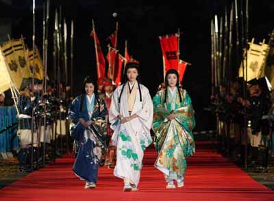 青屋門から150mに渡り敷かれたレッドカーペットの上を、打掛を纏った和央ようかさん、寺島しのぶさん、富田靖子さんの3人が甲冑武者50人を引き連れてウォーキングを行いました。