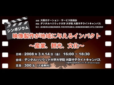 日 時:2008年3月14日(金)16:00~18:30 会 場:デジタルハリウッド大阪校(大阪市北区西天満6-5-17 デジタルエイトビル) 定 員:300名(入場無料、定員になり次第締め切り) 主 催:大阪ロケーション・サービス協議会 共 催:デジタルハリウッド大学 大学院 大阪サテライトキャンパス 協 力:経済産業省近畿経済産業局、特定非営利活動法人映像産業振興機構 (VIPO)大阪事務所 |